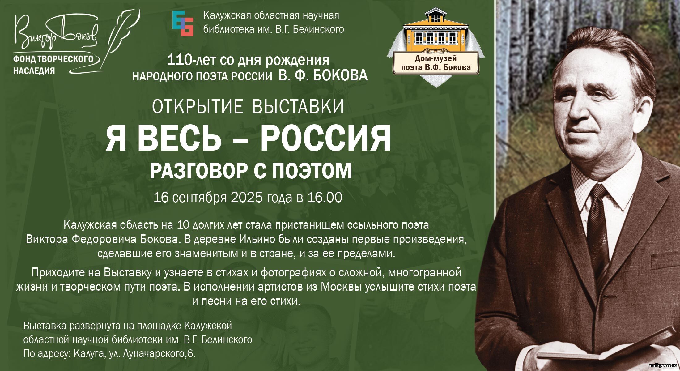 16 сентября 2025 года в 16.00, при поддержке Министерства культуры и туризма Калужской области состоится открытие Выставки «Я весь-Россия! Разговор с поэтом» в Калужской областной научной библиотеки им. В.Г. Белинского.